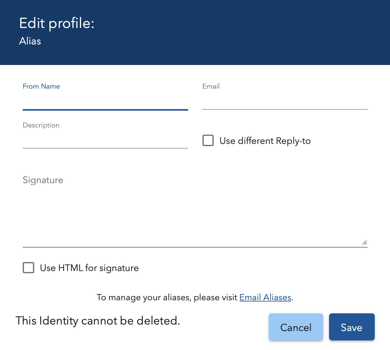 When you create an alias, it automatically becomes part of an Identity. You’ll have the option to customize details (such as the From Name, Signature, or Reply-to Address) or accept the pre-filled default values.