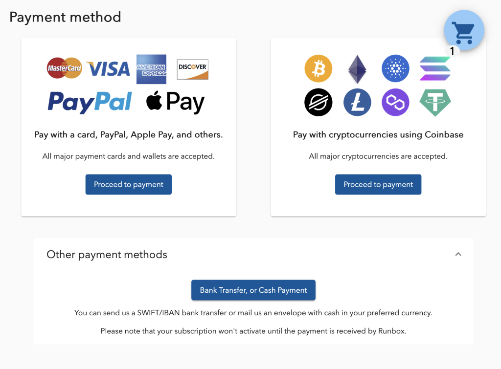 Runbox accepts the following payment methods for subscriptions and upgrades: